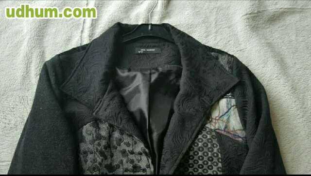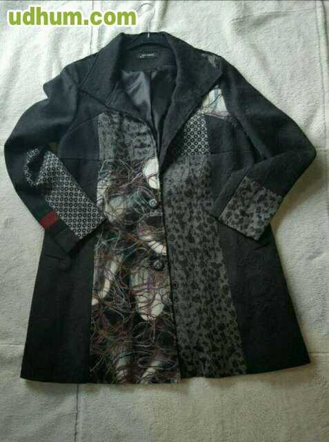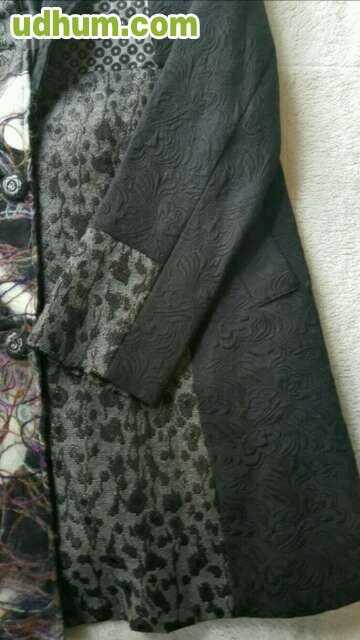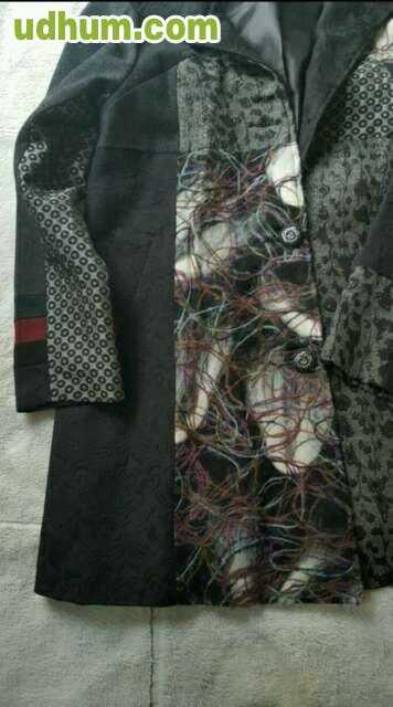 Abrigo joya de verano en color negro con parches en diferentes tejidos, al estilo de las prendas de Desigual. Tiene bolsillos. Es de la marca Mia Donna. Talla M. Tiene una puesta.