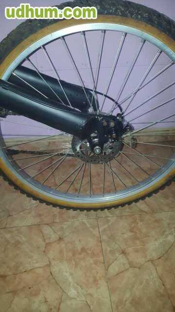Bicicleta dd descenso con freno de disco delantero y trasero normal, suspensiones delantera y trasera muy buenas, cambios de piñones y platos nuevos, neumáticos michelín casi nuevos sin usar.