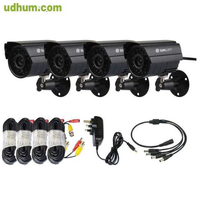 Lote de 4 camaras de vigilancia con vision nocturna de 600 lineas de resolucion para uso interior /exterior marca conceptronic. el lote incluye 4 rollos de cable de 20 metros con clavijas de alimentacion y señal . www. ofertadecamaras. com