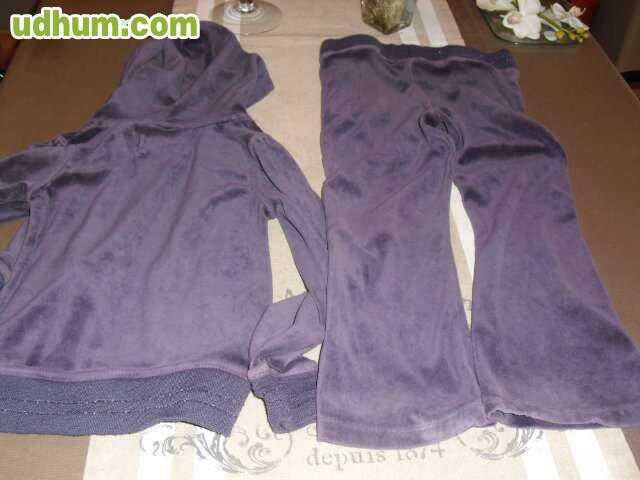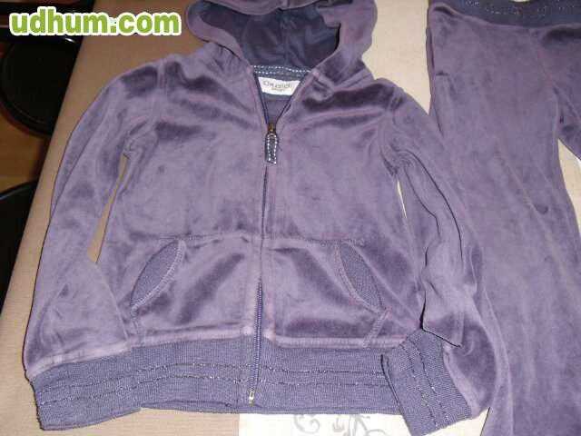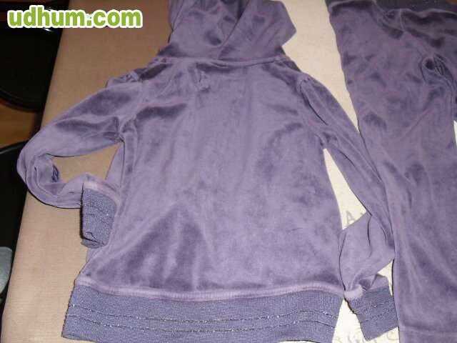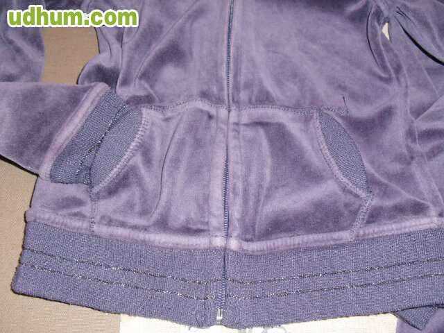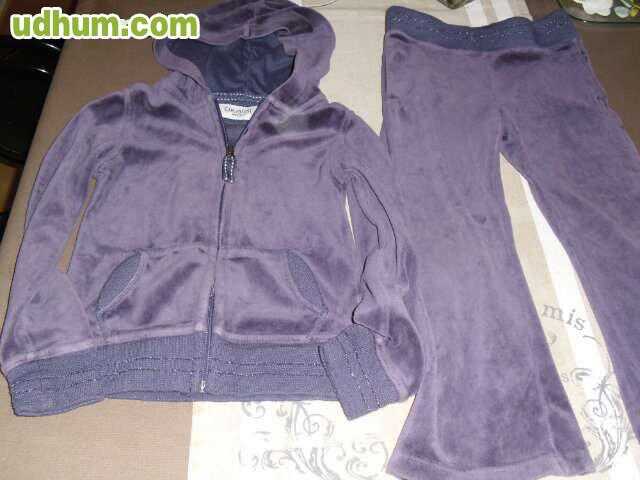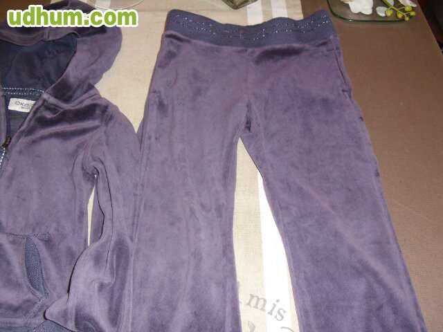 Chandal de terciopelo de la marca OKAIDI. Con capucha. Color Lila Oscuro. Chaqueta totalmente forrada, lleva una ancha goma en el bajo. Bolsillos delanteros laterales. Se cierra con cremallera. Pantalon con ancha goma en la cintura. EN BUENAS CONDICCIONES