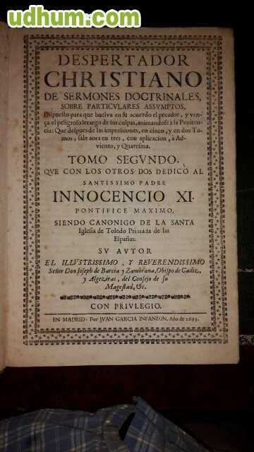 Despertador Cristiano de Sermones Doctrinales sobre particulares asuntos, dispuesto, para que buelva en su acuerdo el pecador, y venza el peligroso letargo de sus culpas, animandole a la penitencia. despues de las impresiones en cinco y en dos tomos sale aora en tres con aplicacion de Advienti y Cuaresma.
