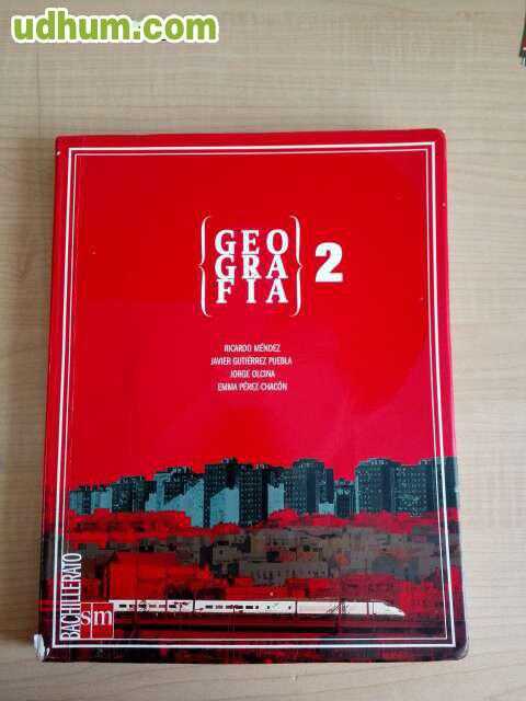 Libro de geografía para segundo de bachillerato. Editorial: SM. Autores: Ricardo méndez, Javier Gutiérrez Pebla, Jorge Olcina y Emma Pérez-Chacón. El libro se encuentra prácticamente nuevo, exceptuando algunos escritos puntuales en determinadas págin