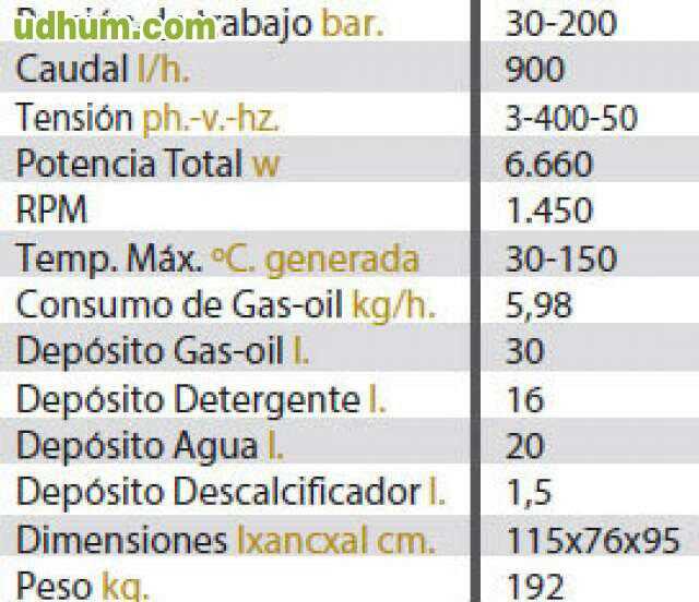 Hidrolimpiadora kruger agua caliente industrial, ideal para la eliminación de todo tipo de suciedad, gracias a su elevado calentamiento del agua hasta 150º. Presión de trabajo bar. 30-200 Caudal l/h. 900 Tensión ph. -v. -hz 3-450-50 Potencia Total w