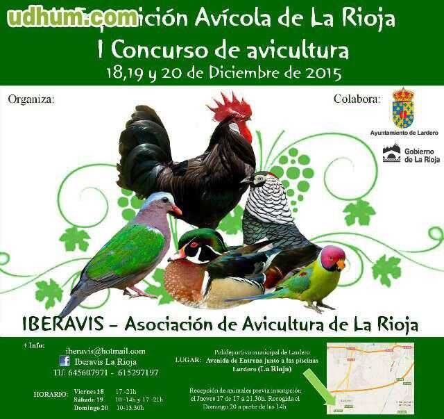 II Exposicion avicola de La Rioja. Este año se celebrara en Lardero en el polideportivo municipal. Los dias viernes 18 (17-21h), sabado 19 (10-14h y 17-21h) y domingo 20 (10-13. 30h). Os Esperamos a todos. Habra gallinas, patos, ocas, faisanes, conejos, palomas, pavos y mucho mas.