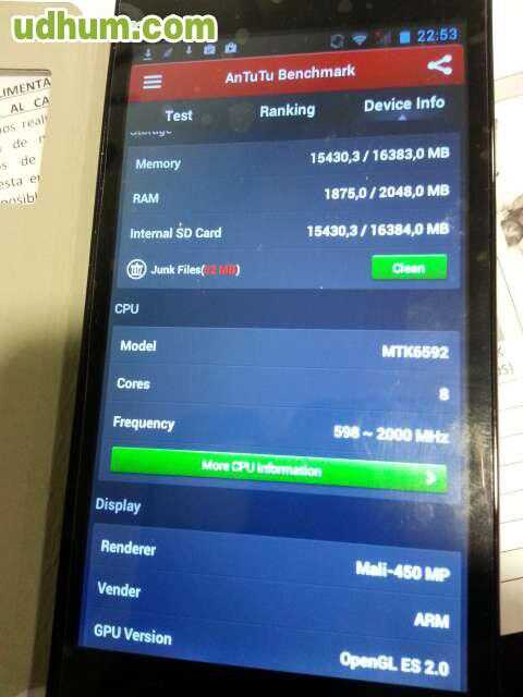 Telefono libre smartphone Lenovo A850+. 1 gb Ram, 4 gb memoria interna ampliable con tarjeta, procesador MT6592 OCHO NUCLEOS a 1, 7 GHZ, camara trasera 5 megapixels y delantera de 0. 3, pantalla de 5, 5 pulgadas de alta resolución. 4 GB de memoria. L