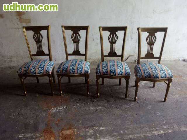 Conjunto de muebles estilo castellano, formado por seis sillas, mueble con puertas, mesa de centro, perchero-paragüero de entrada.