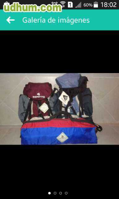 Consta de tienda de campaña con un solo uno, dos mochilas a estrenar en burdeos y azul tipo mochilero. Ambas de marca boomerang y en perfecto estado.