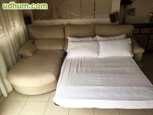 Sofa-cama con chaise longue, muy bien cuidado. No tiene ningún desperfecto. Cabezales reclinables. Se desenfundan todas las piezas. Cama de 1, 35 mtr con colchon de muelles incluido. Se separa en 2 partes para facilitar su transporte. Se halla en domicilio con ascensor. Medidas: 2, 70 mtr de largo 1, 80 mtr largo chaise longue 1 mtr de fondo