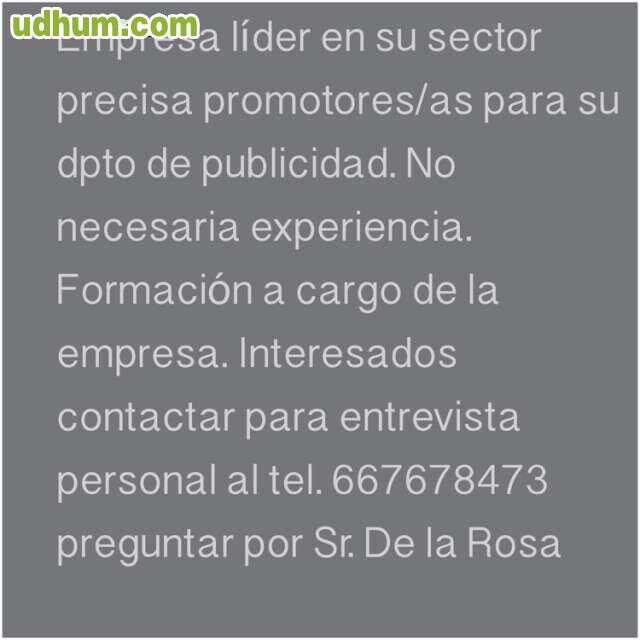 Empresa líder en su sector precisa promotores/as para su dpto de publicidad. No necesaria experiencia. Formación a cargo de la empresa. Interesados contactar para entrevista personal al tel. 667678473 preguntar por Sr. De la Rosa