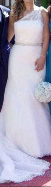 Vestido de novia en perfecto estado. . de la marca aire barcelona, talla 40 , con añadido d cinturóny adorno en el hombro de pedrería . . . . regalo el tocado con el mismo diseño Me costo 800 el vestido, 80 el cinturón , Y 45 el tocado Lo vendo todo por 400
