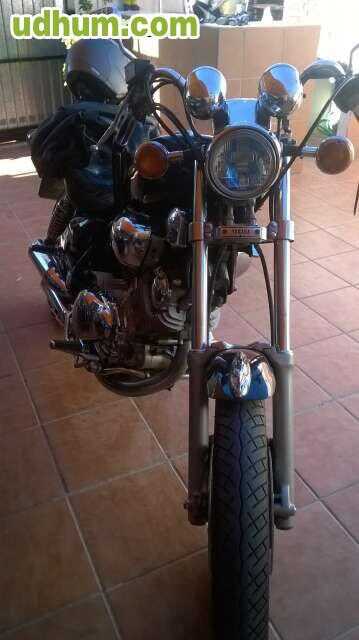 Yamaha Virago 250 en perfecto estado, con respaldo, defensa con estriberas y maletas de cuero traseras y de horquilla. Los espejos, la defensa y las maletas alforjas son originales de Harley-Davidson y tuvieron un coste bastante alto. También se entr